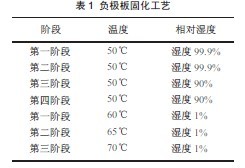負(fù)極板的制備是將鉛粉 、 碳 材 料 、 密 度為1.26g/cm3 的硫酸及添加劑等原材料在一定的工藝條件下混合而成,將和好的膏體利用手工涂板的方式涂在板柵兩面。負(fù)極板的固化干燥按表 1 工藝進行,共72 h。