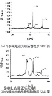 圖 3 是化成后含碳負(fù)極板以及參照電池中負(fù)極板活性物質(zhì)的粉末 X 射線衍射(XRD )圖,從圖中可以看出,對照電池負(fù)極活性物質(zhì)中主要成分是鉛和氧化鉛;而在鉛碳電池負(fù)極板中,炭黑的加入使純鉛的峰強度明顯減弱,而相比較下,氧化鉛的峰強度則明顯上升。有文獻報道,由于碳材料的密度與鉛粉相差很大,故添加炭黑后負(fù)極板的孔隙率大幅上升,使得負(fù)極板易被氧化。