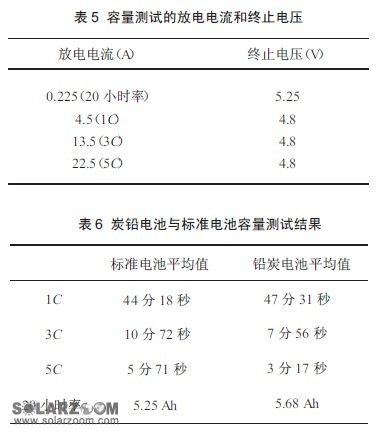 電池容量測試終止電壓及結(jié)果如表 5 和表 6 所示。可以看出鉛碳電池 20 小時率初始容量高于對 照電池( 鉛碳電池負(fù)極板和對照電池負(fù)極板重量相同 ),這可能由于碳材料加入到負(fù)極活性物質(zhì)中,提高了負(fù)極活性物質(zhì)的比表面積和極板的孔隙度,從而使電解液與活性物質(zhì)更加充分地接觸,提高了活性物質(zhì)利用率。在大電流放電測試中,鉛碳電池1C 放電優(yōu)勢明顯,但3C、5C 放電性能不如對照電池。重新對鉛碳電池做1C 放電測試,結(jié)果1C放電放電時間降低了6~7 min,鉛碳電池大電流放電性能比差。