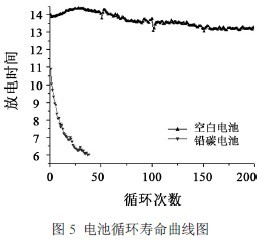 恒流 2.5C,終止電壓為4.8 V,在25 ℃下進行 循環(huán)壽命測試。從圖5可以看出,鉛碳電池循環(huán)壽命很差,僅僅循環(huán)了39 次就達到了循環(huán)終止的要求,而參照電池循環(huán)性能穩(wěn)定。通過電池鎘電壓實驗和拆卸檢測發(fā)現(xiàn),鉛碳電池的問題出在負(fù)極板上,炭黑的加入使極板強度大大降低,特別是化成后對負(fù)極板損傷更為嚴(yán)重,表面滲出一層碳材料,從而導(dǎo)致其循環(huán)性能降低;碳材料的加入會使負(fù)極板析氫嚴(yán)重,也會對電池的循環(huán)壽命產(chǎn)生不利的影響。