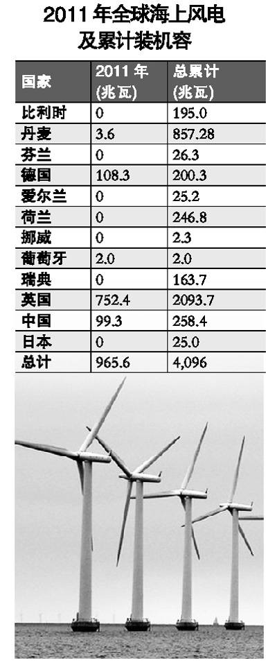 2011年共有235臺(tái)渦輪機(jī)組在九個(gè)風(fēng)電場(chǎng)實(shí)現(xiàn)了并網(wǎng),總?cè)萘窟_(dá)866.4兆瓦,為歐洲累計(jì)輸送了3813兆瓦的海上風(fēng)電。其中,87%的新增容量來(lái)自英國(guó)海域,德國(guó)安裝了108兆瓦,隨后是丹麥3.6兆瓦以及葡萄牙2兆瓦的實(shí)體漂浮式風(fēng)電機(jī)組原型。另有兩個(gè)低端漂浮式風(fēng)電機(jī)組原型在挪威和瑞典進(jìn)行了試驗(yàn)。