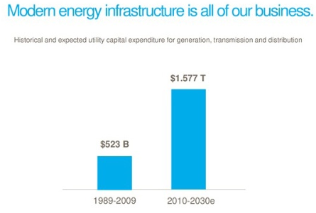 接著,Jurich談到了將來會不斷膨脹的電力基礎設施的總投資成本。美國研究機構(gòu)The Brattle Group的數(shù)據(jù)表明,1989~2009年的20年間,對電力基礎設施(發(fā)電、輸配電網(wǎng))的投資是5230億美元。在之后的20年間(2010~2030年),設想這個數(shù)字會膨脹到約3倍的1.5萬億美元(圖2)。