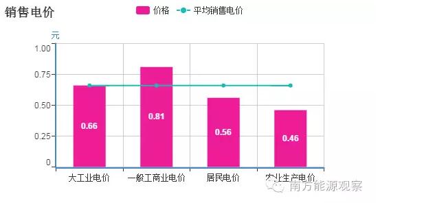 全國平均銷售電價為每千瓦時0.66元,其中大工業(yè)電價0.66元,一般工商業(yè)電價0.81元,居民電價0.56元,農(nóng)業(yè)生產(chǎn)電價0.46元。
