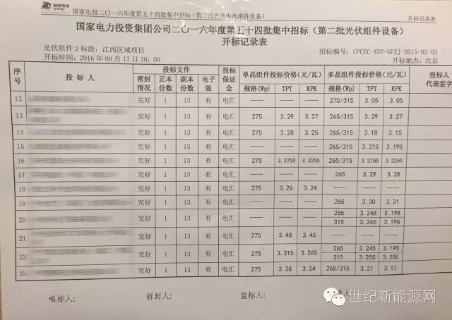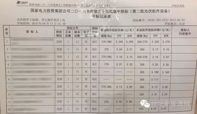 本網(wǎng)記者獲得的一份開標記錄表顯示,投標價格中:多晶KPK背板最低為3.05元/瓦,多晶TPT背板最低為3.05元/瓦。單晶KPK背板最低為3.08元/瓦,單晶TPT背板最低為3.13元/瓦。多晶硅價格普遍在3.25元每瓦左右,多家企業(yè)報價達到3.07元和3.09元,該投標價格是繼中廣核500MW爆出低價之后再創(chuàng)新低。
