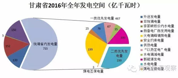 火電企業(yè)一位管理人員介紹說,細分下去,全部735億千瓦時中,必須安排199億千瓦時的火電調峰調頻電量,這是政府部門和電網企業(yè)在保證高峰用電需求最小開機方式下計算得出的。此外還有,25億千瓦時的保證電網安全電量,76億千瓦時的報供熱電量和67億“以熱定電”電量,以上均為一類發(fā)電量。二類發(fā)電量230億千瓦時的水電電量,這其中涉及到甘肅水電的特殊性,從未出現過棄水,一直都是以水定電,保額發(fā)電。這一方面是源于甘肅水電不多易消納,另一方面其與電網調度良好。最后還要,刨去3億千瓦時的煤電互保電量,以及水電35億千瓦時調減指標量后,得出2016年新能源省內優(yōu)先發(fā)電量100億千瓦時。一二類優(yōu)先發(fā)電量占比將近100%,新能源的優(yōu)先地位就顯得不那么明顯。