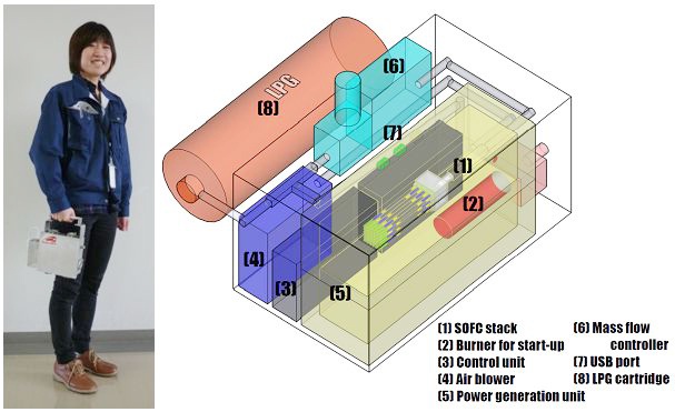 AIST研究所在先進(jìn)陶瓷反應(yīng)堆項(xiàng)目(FY2005 - 2009)支持下開發(fā)出了一種微型SOFC系統(tǒng),內(nèi)部通過甲烷重整制氫,在納米結(jié)構(gòu)的電極催化層上添加了二氧化鈰,運(yùn)行溫度為450 ºC,可在數(shù)分鐘內(nèi)啟動。該便攜式FC系統(tǒng)參加了今年東京的第十二屆納米技術(shù)展覽,展示了這種在緊急情況下可以為小型電子設(shè)備供能的燃料電池系統(tǒng)。