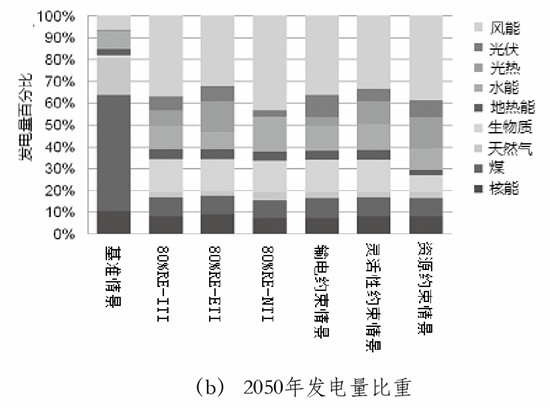 2050年,美國(guó)可再生能源發(fā)電量比重為80%的可能性較大,但是未來(lái)發(fā)展中面臨著一系列不確定的影響因素,為此對(duì)約束條件進(jìn)行假設(shè)顯得尤為重要,如技術(shù)發(fā)展水平、電力輸送約束、電網(wǎng)靈活性約束以及資源供應(yīng)約束等?!肚熬把芯俊丰槍?duì)不同的約束條件對(duì)80%可再生能源電量情景進(jìn)行了敏感性分析,各類型可再生能源比例分布如圖2所示。