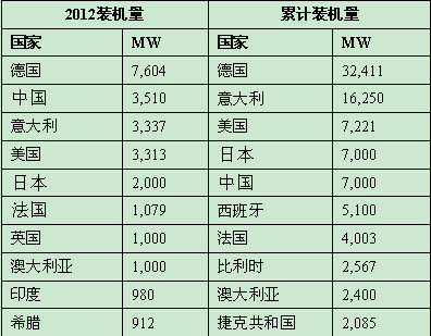 就2012年光伏裝機(jī)量以及累計(jì)裝機(jī)量而言,下表列出了全球十大光伏市場(chǎng):