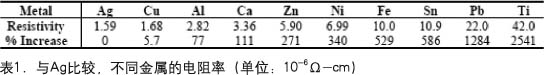 確定Ag合適替代品的主要考慮因素是材料的豐度和電阻率。作為指形電極,替代金屬的電阻率必須低且與Ag的電阻率相當(dāng)。若采用較高電阻率的金屬,為了保持同樣的指形電阻,指形電極的寬度或高度就不得不增加。這樣,或者電池效率受損,或者制造難度增加。