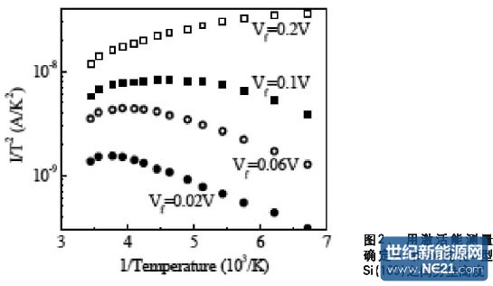 實驗是在低劑量1015cm-3Sb摻雜n型Si(100)硅片上進行的。鈍化后,在硅片上用電子束蒸發(fā)和剝離(lift-off)工藝制作直徑200μm的Al圓點。重要的是,鈍化后的濺射工藝要緩和,因為濺射淀積能破壞鈍化層。圖2說明確定Se鈍化n型Si(100)上Al勢壘高度的激活能測量,以及斜率給出的勢壘高度。取決于偏壓,勢壘高度在0.06-0.10eV間變化,遠遠低于Al/n型Si接觸長期建立的值0.72eV。