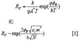 創(chuàng)紀(jì)錄低的勢壘高度應(yīng)導(dǎo)致Al和n型Si間極低的接觸電阻。輕摻雜與重?fù)诫sSi的接觸電阻分別由下面二式給出: