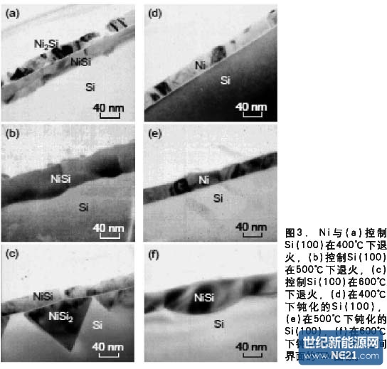 實驗是通過檢驗在Se鈍化Si(100)表面上Ni硅化進行的。在二片Si(100)硅片上淀積50nm Ni膜,一片有Se鈍化,另一片沒有Se鈍化。在N2中400-700℃間加熱這些樣品60秒 進行硅化,用透射電子顯微鏡檢查Ni/Si界面。結(jié)果示于圖3。對于沒有Se且在400℃下退火的控制樣品,觀察到硅化,結(jié)果在Ni和Si間有二層硅化物堆疊(圖3(a))。這證實了Foll等人早先對于Ni硅化的TEM研究。他們的結(jié)論是,二層堆疊分別為Ni2Si和NiSi。500℃退火后,單層NiSi出現(xiàn)在控制樣品的Ni/Si界面(圖3(b))。但是,鈍化樣品的表現(xiàn)完全不同。400℃退火后(圖3(d)),Ni與Se鈍化Si(100)表面間沒有硅化而且界面陡削。500℃退火后,Ni與Se鈍化Si(100)表面間仍然沒有明顯的反應(yīng)(圖3(e))。僅僅在600℃退火后,Ni與Se鈍化Si(100)反應(yīng)形成單層NiSi(圖3(f))。因此,Ni/Se鈍化Si(100)界面的熱穩(wěn)定性是~400℃。