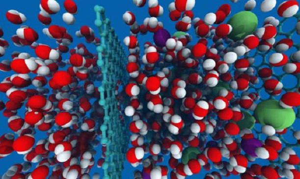 當(dāng)水分子(圖中的紅色和白色)、鈉和氯離子(圖中綠色和紫色)面對(duì)一張石墨烯(圖中心處淡藍(lán)色的),只有適當(dāng)尺寸的粒子能從石墨烯的孔隙穿過,即水能通過,而鹽類的鈉和氯被擋住了。