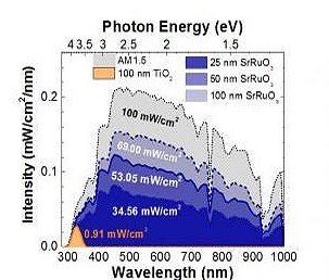 SrRuO3可見(jiàn)光吸收率強(qiáng)。據(jù)上圖可見(jiàn),SrRuO3吸收可見(jiàn)光量是TiO2的75倍。受到載流子注入的驅(qū)動(dòng),TiO2與SrRuO3結(jié)構(gòu)、化學(xué)與電子的兼容性能夠制造出具有光催化反應(yīng)及光伏活力加強(qiáng)的異質(zhì)結(jié)