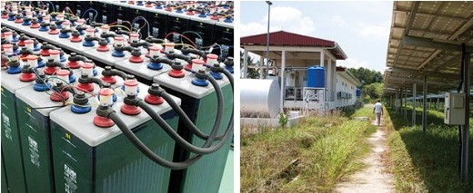 在丹戎巴都勞勿鎮(zhèn)附近,一大排太陽能板(右圖)把電儲存到建筑內(nèi)部的一列鉛酸蓄電池(左圖)中。柴油發(fā)電機坐落在平臺上,和太陽能板以及蓄電池一起組成了微電網(wǎng)電站。