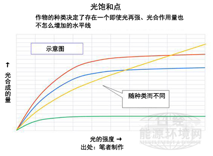 解開這個謎團的關鍵在于“光飽和點”這個概念。一般認為在植物生長過程中日照量越多越好,但其實并非如此。實際上,每種作物都有一個極限,超過其范圍的光對于提高光合強度不再起作用。這個極限即稱為該植物的光飽和點。