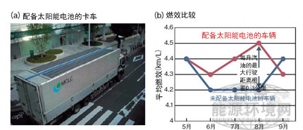三家公司在卡車上實際配備1.2千瓦太陽能電池模塊進行實證實驗的結果顯示,1個月的平均燃效最多可改善0.3公里/升。準備了款式及出產年份相同的卡車,對進行實際運營時的燃效進行了比較。結果顯示,通過配備太陽能電池,可將休息及等貨等怠速停止5分鐘以上的時間,削減50%左右,有助于改善燃效。