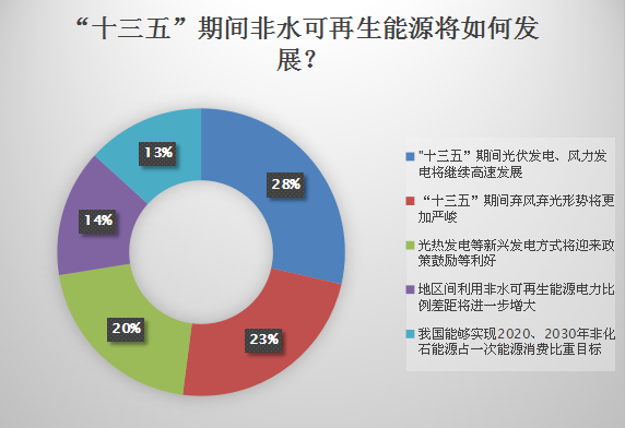 “十三五”期間,非水可再生能源究竟會(huì)怎樣發(fā)展?日前,中國(guó)電力新聞網(wǎng)以及中電傳媒微博、微信、論壇發(fā)起關(guān)于“十三五”期間非水可再生能源將如何發(fā)展”的話題征集活動(dòng),調(diào)查結(jié)果如下:28%的受訪者認(rèn)為,“十三五”期間光伏發(fā)電、風(fēng)力發(fā)電將繼續(xù)高速發(fā)展;23%的受訪者認(rèn)為,“十三五”期間棄風(fēng)棄光形勢(shì)將更加嚴(yán)峻;20%的受訪者認(rèn)為,光熱發(fā)電等新興發(fā)電方式將迎來(lái)政策鼓勵(lì)等利好;14%網(wǎng)友的受訪者認(rèn)為,地區(qū)間利用非水可再生能源電力比例差距將進(jìn)一步增大;13%的受訪者認(rèn)為,我國(guó)能夠?qū)崿F(xiàn)2020、2030年非化石能源占一次能源消費(fèi)比重目標(biāo)。