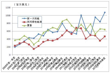 但日本的夏普和中國的英利綠色能源的銷售額在2011年以后開始出現(xiàn)下滑趨勢。為方便對三家公司進(jìn)行比較,將夏普的銷售額按各季度末的匯率換算成了美元,因此還受到了匯率的一些影響,不過即使按日元來看,夏普的銷售額在2010年以前增加、2011年以后減少的趨勢也沒有變。