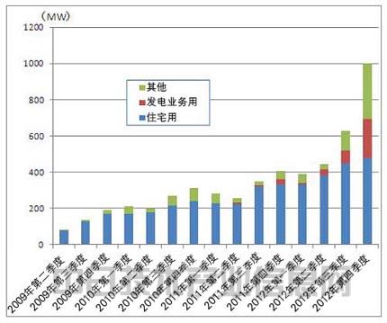 取代歐洲實(shí)現(xiàn)增長的是亞洲和美洲。在亞洲,中國、日本和印度三大市場將實(shí)現(xiàn)增長。日本從2012年7月開始實(shí)行可再生能源固定價(jià)格收購制度,太陽能電池板的設(shè)置數(shù)量隨之猛增。日本的太陽能電池板出貨量在2012年第四季度首次達(dá)到了1GW(圖2)。其中,住宅用途約占一半,包括百萬瓦級(jí)光伏電站在內(nèi)的發(fā)電業(yè)務(wù)用途占2成多。