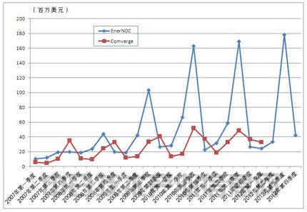 美國EnerNOC銷售額走勢的特點(diǎn)是,在最需要進(jìn)行供求調(diào)整的第三季度銷售額明顯增加。該公司的銷售額走勢波動(dòng)較大,但整體呈增加趨勢。美國Comverge因2012年3月發(fā)布了收購消息,銷售額數(shù)據(jù)只到2012年第一季度,但到此時(shí)為止一直穩(wěn)步增長。