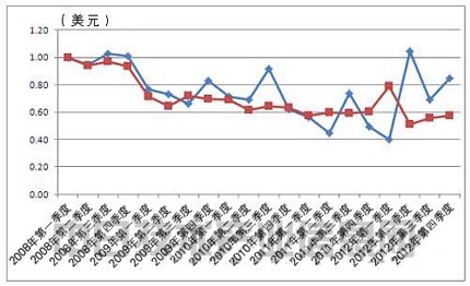 圖4:太陽能電池板每GW的銷售額指數(shù)走勢,根據(jù)First Solar和夏普各季度的出貨量和銷售額計(jì)算得出。以2008年第一季度的值為1進(jìn)行了指數(shù)換算。藍(lán)色為First Solar,紅色為夏普。