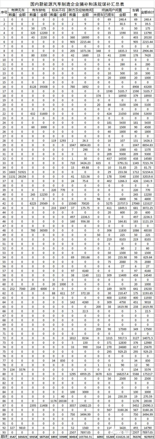 而在9月8日下午和晚間,一份未經(jīng)證實(shí)的“騙補(bǔ)名單”中,更多主流車(chē)企名列其中,它們被曝光都有不同程度的騙補(bǔ)和違規(guī)套取補(bǔ)貼行為——少到30多萬(wàn),多到5個(gè)億,93家被調(diào)查企業(yè)中僅21家沒(méi)有騙補(bǔ)和違規(guī)套取補(bǔ)貼行為。這種規(guī)模的騙補(bǔ)一旦被官方證實(shí),顯然超出了任何一位專(zhuān)家或行業(yè)人士的設(shè)想。