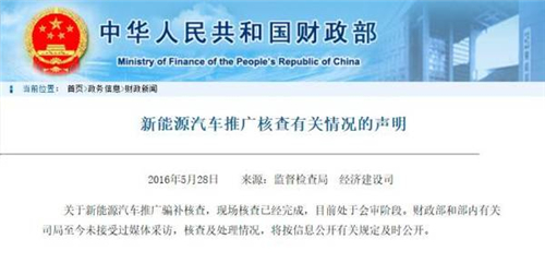 5月28日,財(cái)政部官網(wǎng)發(fā)布聲明:關(guān)于新能源汽車(chē)推廣騙補(bǔ)核查,現(xiàn)場(chǎng)核查已經(jīng)完成,目前處于會(huì)審階段。財(cái)政部和部?jī)?nèi)有關(guān)司局至今未接受過(guò)媒體采訪(fǎng),核查及處理情況,將按信息公開(kāi)有關(guān)規(guī)定及時(shí)公開(kāi)。