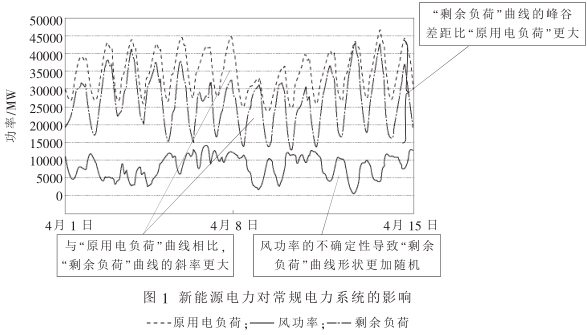確保安全、高質(zhì)量供電,同時維持電力供需平衡是電力系統(tǒng)面臨的持續(xù)挑戰(zhàn)。社會的用電需求是實時變化的,晝夜和季節(jié)性用電負荷存在峰谷差,而電力供需平衡的常規(guī)調(diào)節(jié)方式是通過改變發(fā)電機組的出力來適應(yīng)需求變化。在役發(fā)電機組可分兩類:承擔基本負荷的機組(下稱:基荷機組)和變負荷機組?;蓹C組的出力基本維持不變,而變負荷機組的出力則隨需求的變化而變化。為分析新能源電力對常規(guī)電力系統(tǒng)的影響,將新能源發(fā)電量視為所減少的用電負荷,此時常規(guī)發(fā)電機組需要提供的電量等于原用電負荷減去新能源機組的發(fā)電量,文中定義為“剩余負荷”。對比“原用電負荷”和“剩余負荷”曲線,可說明新能源電力對常規(guī)電力系統(tǒng)的影響。圖1是美國Texas州某地區(qū)2005年的雙周用電負荷與風力發(fā)電數(shù)據(jù)[1]。