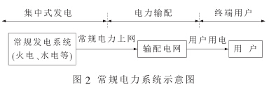 常規(guī)電力系統(tǒng)可簡化為如圖2所示,系統(tǒng)包括集中式發(fā)電、電力輸配、終端用戶3個環(huán)節(jié),系統(tǒng)運轉(zhuǎn)模式是“即用即發(fā)”,即發(fā)電端根據(jù)用戶端負荷的變化來調(diào)節(jié)發(fā)電量,此種運轉(zhuǎn)模式面臨著非??量痰淖冐摵梢?。
