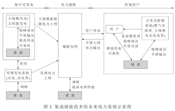 未來的電力系統(tǒng)要包含可再生新能源電力,而新能源電力的大比例接入則會出現(xiàn)前面提到的潛在問題。如圖3所示,在電力系統(tǒng)中采用集成儲能模塊是解決電力系統(tǒng)變負荷和新能源電力接入產(chǎn)生問題的有效措施。