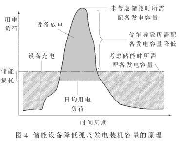 在電力系統(tǒng)中引入儲能模塊,在不同時間點進行電能吞吐,相當于在電力系統(tǒng)中添加了一個可調(diào)節(jié)維度,最終實現(xiàn)整個系統(tǒng)的高效、低成本和可靠運行。此外,電力儲能在離網(wǎng)孤島終端的使用也是其重要的應(yīng)用場合,通過設(shè)置適當規(guī)模的電力儲能裝置,在用電低谷時充電、用電高峰時放電,會降低離網(wǎng)孤島終端所需匹配的發(fā)電能力/容量,同時使發(fā)電機組維持運行在穩(wěn)定工況,提高整個系統(tǒng)的能量效率和經(jīng)濟性能,圖4說明了其原理。
