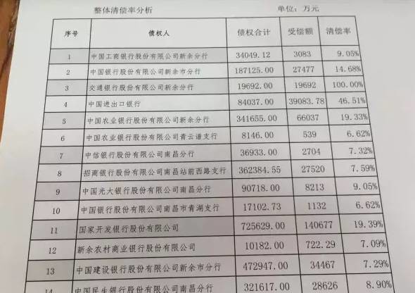 根據(jù)管理人聘請的評估機構評估,參與破產(chǎn)重組的光伏硅、多晶硅、高科技、新余賽維四家子公司資產(chǎn)總體評估值為76.52億元,而今年3月這四家企業(yè)資產(chǎn)評估總值121.86億元,評估值降幅達37.2%。資產(chǎn)評估價值大幅下降之后,隨之而來的就是債權清償率的急驟降低。賽維對各債權銀行整體清償率為14.75%,遠低于在行業(yè)最困難時重組的無錫尚德和*ST超日。