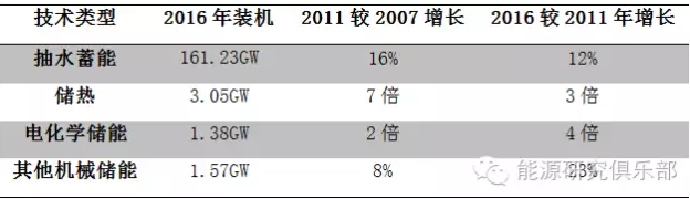 以2011年為分界點,前5年儲熱裝機增速最快,較2007年增加7倍,后5年化學儲能則成為發(fā)展最快的技術,詳見表3。