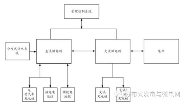 直流微電網(wǎng)包括直流母線,以及分別通過各自的變流器連接直流母線的分布式直流供電裝置、直流儲(chǔ)能裝置、直流充電樁和換電電池直流充放電裝置。