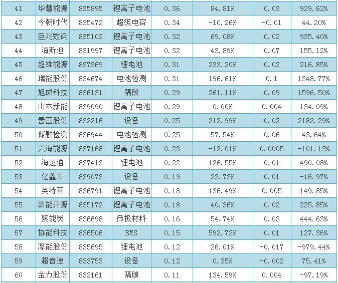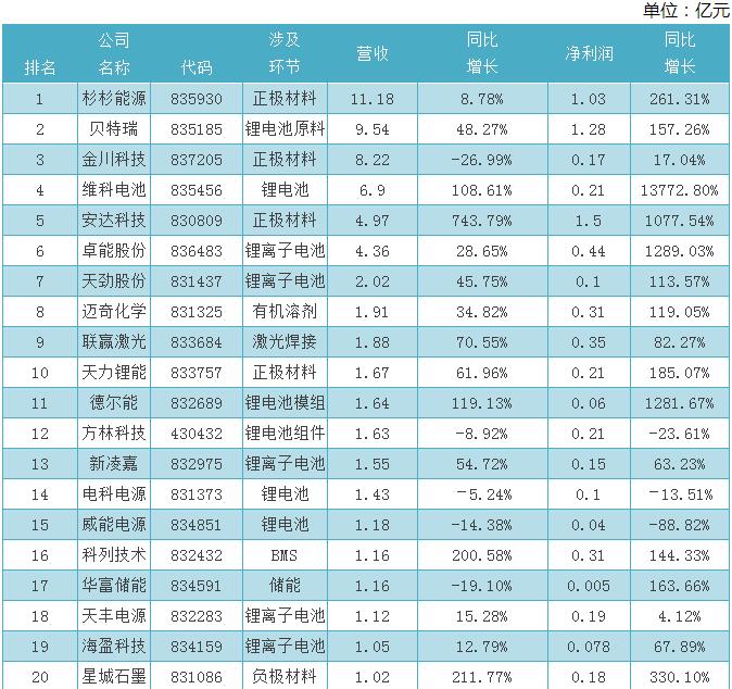 鋰電池營業(yè)收入排名前10的鋰電池新三板公司分別是杉杉能源、貝特瑞、金川科技、維科電池、安達科技、卓能股份、天勁股份、邁奇化學、聯(lián)贏激光、天力鋰能。