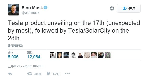 中國(guó)儲(chǔ)能網(wǎng)訊:日前,特斯拉CEO埃隆·馬斯克在社交網(wǎng)站推特上透露,特斯拉將于10月17日發(fā)布一款新產(chǎn)品。據(jù)外媒猜測(cè),新產(chǎn)品有可能是第二代Autopilot自動(dòng)輔助駕駛技術(shù)的相關(guān)軟硬件產(chǎn)品,也有可能是最終“定妝”的量產(chǎn)版特斯拉MODEL 3。隨后在10月28日,特斯拉還有望發(fā)布一款結(jié)合了太陽(yáng)能技術(shù)、電池存儲(chǔ)技術(shù)及電動(dòng)車充電系統(tǒng)的新產(chǎn)品,這款產(chǎn)品由特斯拉與SolarCity合作研發(fā)。