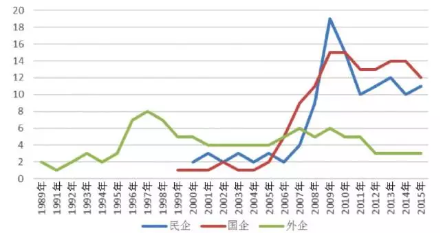 中國風(fēng)電整機制造企業(yè)累計共有73家,外企21家,民企26家,國企20家,這些企業(yè)在風(fēng)電發(fā)展的三十年間陸陸續(xù)續(xù)有進有退,直到2015年,外企3家,國企12家,民企11家。從風(fēng)電制造企業(yè)個數(shù)變化看,上世紀(jì)九十年代,外資企業(yè)獨占中國市場,起初只有2家至3家進入中國市場,1997年達到最多,出現(xiàn)8家,隨后又減少到5家左右;隨著風(fēng)電技術(shù)的引進,中國制造企業(yè)起步于本世紀(jì)初,2000年還不到五家,2005年起開始增長,2009年達到最多,當(dāng)年企業(yè)數(shù)量為34家(民企19家,國企15家),2011年又一度減退到23家(民企10家,國企13家)?!笆濉逼陂g,無論是外資企業(yè)還是中國企業(yè),較之前都有明顯的減少,近兩年維持穩(wěn)定在25家左右。