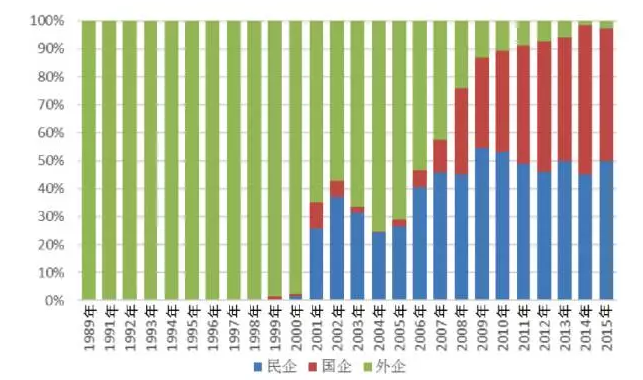 從風(fēng)電制造企業(yè)歷年新增裝機容量看,2000年之前,外企獨占整個中國風(fēng)電市場。2001年起中國風(fēng)電市場格局發(fā)生改變,中國企業(yè)勢力開始增強,市場占有率達到35.4%(民企25.9%,國企9.5%),外企下降到64.6%。但2003年至2004年,中國企業(yè)出現(xiàn)萎縮,2004年占有率下降到不足25%,且?guī)缀跞縼碜悦衿?,而外企市場占有率達到75%。2005年,隨著中國企業(yè)數(shù)量的增加,市場占有率也在逐年攀升,尤其國企增長明顯,從圖2可以看出,外企的市場份額逐漸被國企吞噬。2014年中國企業(yè)市場占有率達到歷史高點98.3%(民企45.3%,國企53%),外企1.7%。