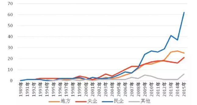 風(fēng)電開發(fā)企業(yè)主要為中國企業(yè),外商投資企業(yè)進入中國市場非常有限。在國企中,主要分布有中央直屬企業(yè)和地方國企。從風(fēng)電開發(fā)企業(yè)數(shù)量變化看,2004年以前,不足10家企業(yè),從2005年起逐年增長,到2013年超過80家,其中央企17家,地方國企26家,民企41家(國企和民企均超過40家,在此期間,國企的數(shù)量一直比民企多);到2015年,企業(yè)數(shù)量共計超過100家企業(yè),民企數(shù)量突破60家,超過國企,央企和地方國企數(shù)量與2013年相比變化不大。