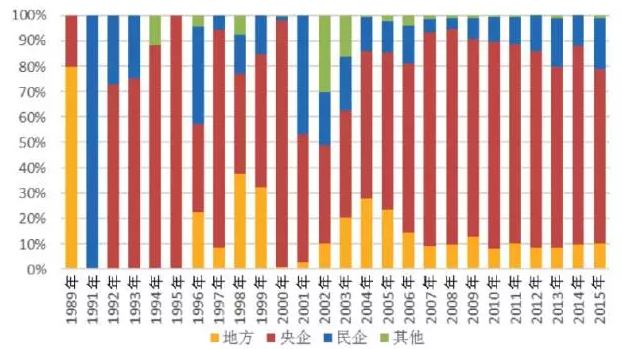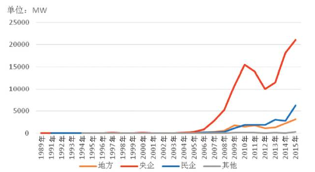 從歷年新增裝機的市場占有率看,從2005年到2015年,國企的市場占有率均超過80%,在2008年最高達到95%,之后又回落在80%至90%之間,其中,央企的市場占有率達到70%至80%之間,而地方國企僅占10%左右。從2009年至2015年,民企市場占有率整體趨勢顯示增強,尤其在2013年和2014年,民企市場占有率達到20%左右。
