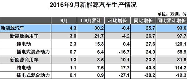 據(jù)中汽協(xié)會(huì)統(tǒng)計(jì),9月新能源汽車(chē)生產(chǎn)4.3萬(wàn)輛,銷(xiāo)售4.4萬(wàn)輛,同比分別增長(zhǎng)25.7%和43.8%。其中純電動(dòng)汽車(chē)產(chǎn)銷(xiāo)分別完成3.4萬(wàn)輛和3.5萬(wàn)輛,同比分別增長(zhǎng)31.6%和63.1%;插電式混合動(dòng)力汽車(chē)產(chǎn)銷(xiāo)分別完成0.8萬(wàn)輛和0.9萬(wàn)輛,產(chǎn)量同比增長(zhǎng)6.3%,銷(xiāo)量下降2.1%。