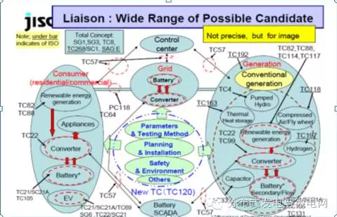 IECTC120:由于IEC/TC120成立較晚,其工作范圍包含儲能載體及裝備技術(shù)、儲能系統(tǒng)集成技術(shù)、儲能系統(tǒng)接入(并網(wǎng))與控制技術(shù)以及儲能應(yīng)用技術(shù)等,跨際多個學(xué)科領(lǐng)域。因此,TC120與IEC其他工作組關(guān)系相對復(fù)雜,在制定標(biāo)準(zhǔn)體系方面困難較大。目前,IECTC120已經(jīng)成立5個工作組:術(shù)語、單位參數(shù)和測試方法、規(guī)劃和安裝、環(huán)境問題、安全事項,力圖規(guī)劃其標(biāo)準(zhǔn)體系。