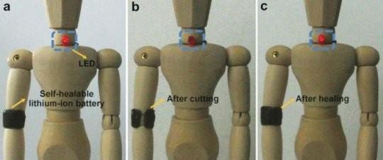 開發(fā)這項技術的研究團隊,利用佩戴在玩偶手臂上的柔性腕帶形狀電池進行了演示。電池受到損傷后,會自己“長好”,恢復供電,就像沒有受到過損傷一樣。