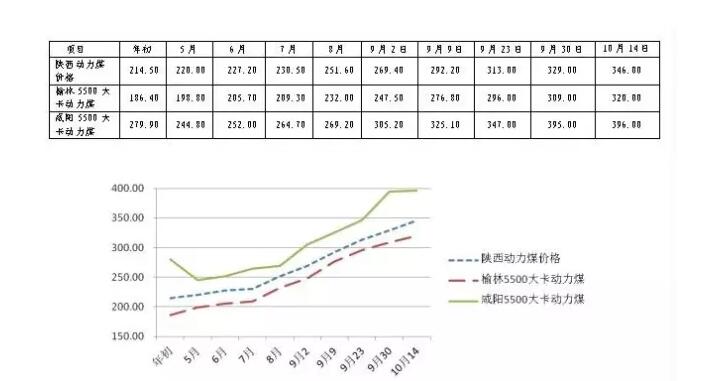 2016年上半年,陜西電煤供應(yīng)較為充裕,價格走勢平穩(wěn),基本維持在214-218元/噸。隨著供求關(guān)系緊張,電煤價格從6月份開始持續(xù)上漲,8月底漲至251.50元/噸,較5月底增長14.36%。進(jìn)入9月以來,煤炭價格上漲加速,以每周20元/噸左右大幅攀升,僅9月至今電煤每噸上漲94.40元,比8月末上漲37.52%;截至10月14日,陜西動力煤價格漲至346元/噸,比5月底增長126元,漲幅57.27 %。具體情況見下表: