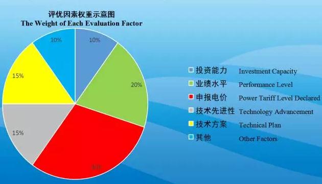 另外,領(lǐng)跑者項(xiàng)目評(píng)優(yōu)要求參考多項(xiàng)因素,各基地通過競(jìng)爭(zhēng)性比選的方式,考慮企業(yè)投資能力、業(yè)績(jī)水平、技術(shù)先進(jìn)性、技術(shù)方案、企業(yè)申報(bào)電價(jià)等因素進(jìn)行優(yōu)選,最終選出綜合實(shí)力較優(yōu)的投資企業(yè)。申報(bào)電價(jià)在其中占30%的權(quán)重(由于各地區(qū)項(xiàng)目建設(shè)條件存在差異,實(shí)際工作中略有微調(diào))。投標(biāo)電價(jià)并不是領(lǐng)跑者項(xiàng)目唯一參看的評(píng)優(yōu)因素。技術(shù)先進(jìn)性、技術(shù)方案合計(jì)同樣占評(píng)優(yōu)因素權(quán)重的30%。其余還考慮到投資企業(yè)業(yè)績(jī)水平、投融資能力等多種因素。