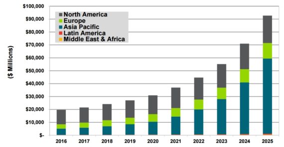 報(bào)告中預(yù)計(jì),2016年,全球宅用分布式能源市場(chǎng)年收入約為197億美元,到2025年將增至927億美元,平均年增率達(dá)到18.8%,由此推算,2016-2025年,全球宅用分布式能源市場(chǎng)累計(jì)收入將達(dá)到4230億美元。