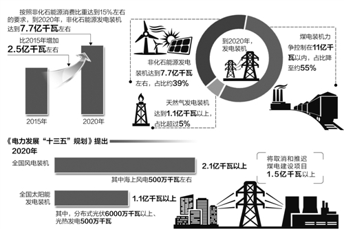 在電源結(jié)構(gòu)方面。按照非化石能源消費(fèi)比重達(dá)到15%左右的要求,到2020年,非化石能源發(fā)電裝機(jī)達(dá)到7.7億千瓦左右,比2015年增加2.5億千瓦左右,占比約39%,提高4個(gè)百分點(diǎn),發(fā)電量占比提高到31%;天然氣發(fā)電裝機(jī)增加5000萬(wàn)千瓦,達(dá)到1.1億千瓦以上,占比超過(guò)5%;煤電裝機(jī)力爭(zhēng)控制在11億千瓦以內(nèi),占比降至約55%。電源結(jié)構(gòu)得到進(jìn)一步優(yōu)化。