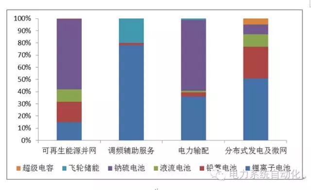 圖2 中國不同類型儲(chǔ)能技術(shù)應(yīng)用于電力系統(tǒng)各個(gè)領(lǐng)域的分布圖