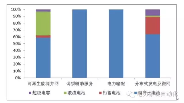 截止到2015年底,中國不同類型儲(chǔ)能項(xiàng)目在電力系統(tǒng)各個(gè)應(yīng)用領(lǐng)域的累計(jì)裝機(jī)分布如圖2所示。